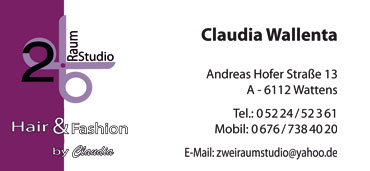 2 Raum Studio Hair & Fashion - Wallenta Claudia Andreas-Hofer-Str 13, 6112 Wattens , www.zweiraumstudio.at |
